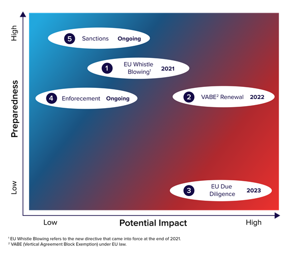 Across the x-axis is the potential impact on the organization, with preparedness across the y-axis. The color coding gives a rough indication of where the board should focus its attention – red for high alertness and green for topics that have lower impact or where the company looks to be fully prepared. Each regulation has some simple labeling to ease discussion, including the year when the regulation came / will come into force.