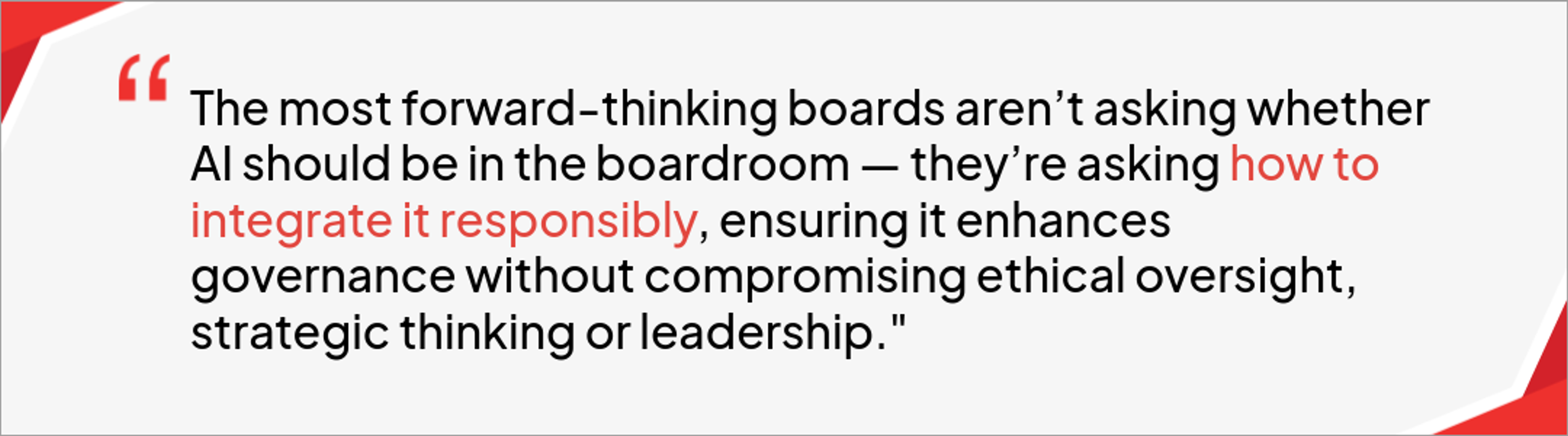 For today’s boards, the ability to make sound, strategic decisions has never been more complex or more critical. Directors must navigate shifting regulations, growing stakeholder expectations and an unprecedented volume of data. In this highly pressurized and time-sensitive environment, artificial intelligence is emerging as both a powerful tool and a source of uncertainty.
