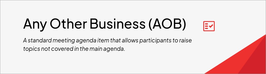 “Any other business” (AOB) is a standard meeting agenda item that allows participants to raise topics not covered in the main agenda. It provides an opportunity to discuss urgent matters, minor updates or emerging issues. While AOB can bring flexibility to board meetings, some organizations limit its use in favor of efficiency and predictability.