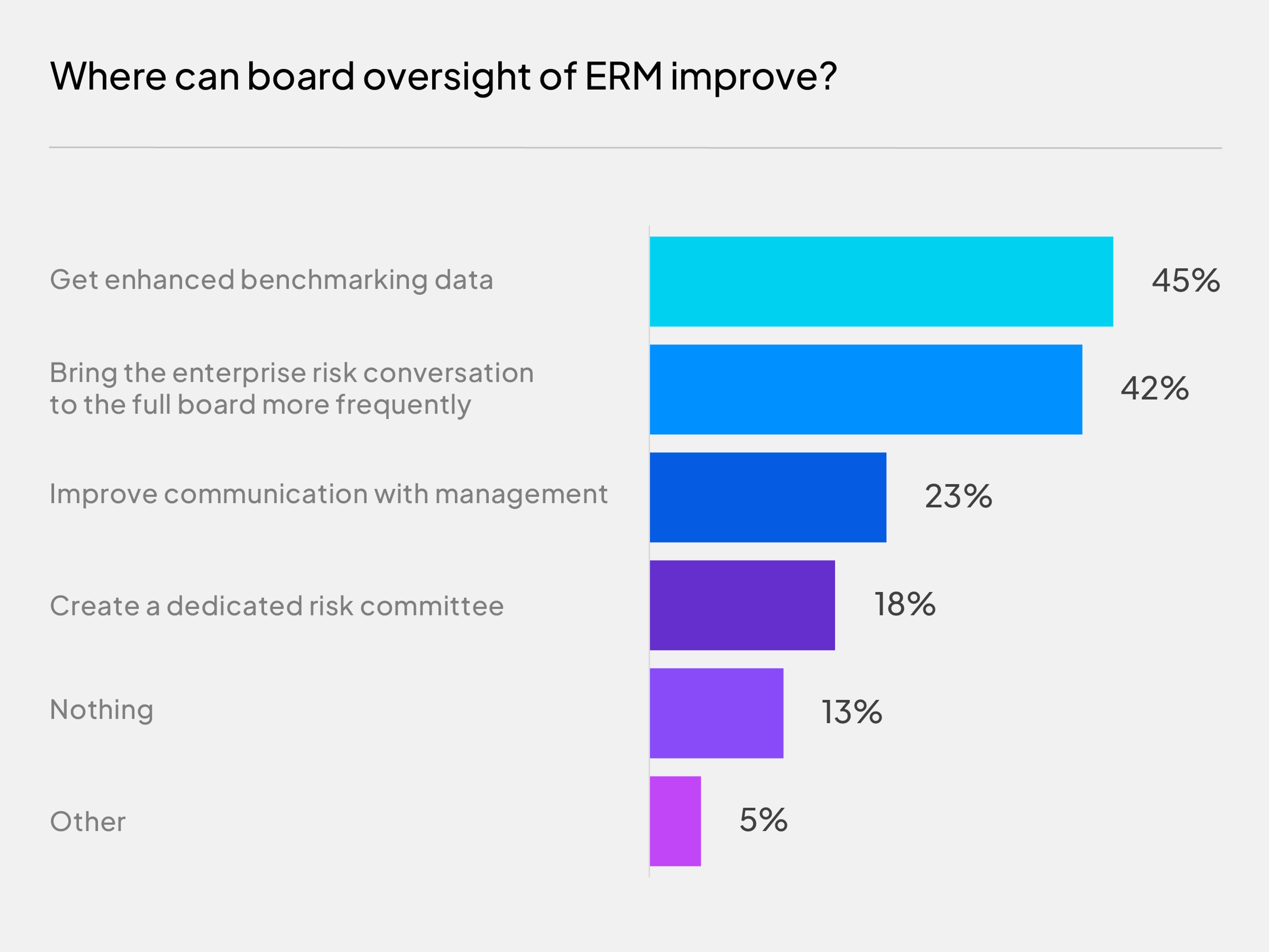 For now, ERM remains anchored in the audit committee for most boards, though 42 percent of those we surveyed said if they could improve their board’s oversight of risk, they would bring the ERM conversation out of the committee to the full board more frequently.