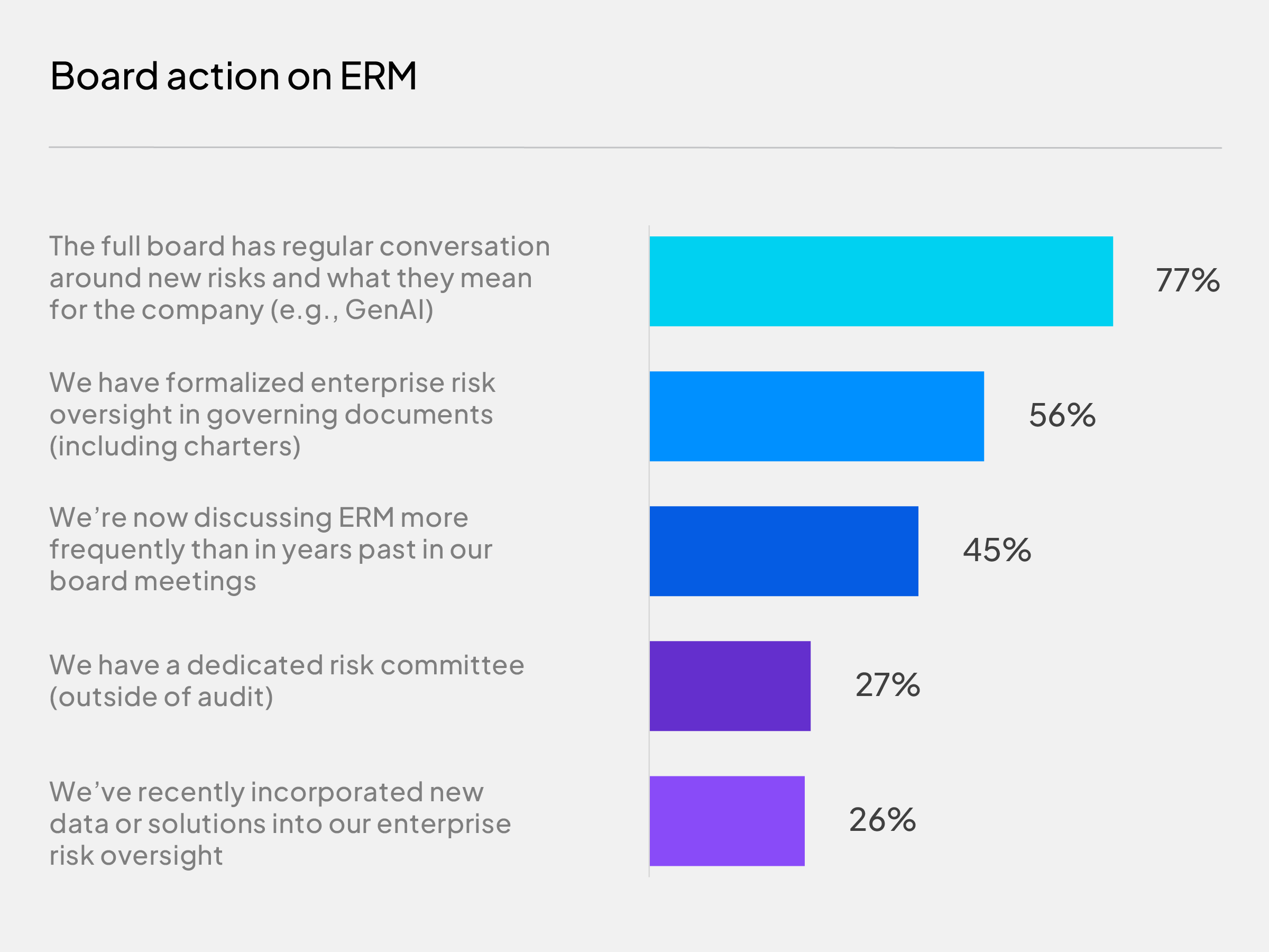 “The risk oversight landscape has changed drastically in the past few years, and companies’ ERM programs have matured as a result,” said Schindlinger. “As that happens, the data and insights available to the board needs to reflect this evolution. Directors are voicing an acute need: they need the right technology to surface information about enterprise risk to help them make informed decisions.”